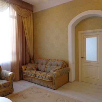 Двуспальная кровать, диван (раскладной), шкаф для одежды, гладильная доска, набор посуды, тумбочки, стол, стулья